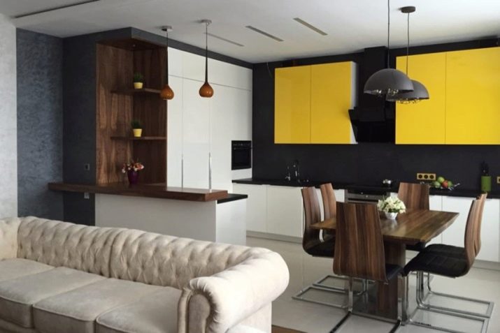 يبدو تقسيم الغرفة بمساعدة الهيكل الزاوي جميلًا وأصليًا. ينصح المصممون بوضع الأثاث في وسط الغرفة ، وليس في الزاوية ، وبالتالي فصل مناطق الطهي وتناول الطعام. وبالتالي ، لا تتداخل منطقة العمل مع منطقة الراحة. لغرفة معيشة تبلغ مساحتها 13 مترًا مربعًا. م و 12 مترا مربعا. متر ، يمكن أن تكون الفكرة الجيدة للداخلية كلاسيكية ثابتة أو مشروعًا على طراز فن الآرت نوفو. تصميم غرفة الأثاث الكلاسيكي قياسي. لا تتقاطع منطقة العمل وغرفة الطعام ، ولكن يمكن فصلهما بصريًا عن بعضهما ليس بواسطة أريكة ناعمة ، ولكن بجدار من اللوح الجصي أو ستائر.