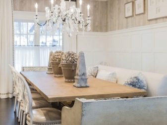 تعتبر أريكة المطبخ على طراز بروفانس حلاً ممتازًا للديكور الداخلي الذي تهيمن عليه التأثيرات الفرنسية. أفضل الألوان للأثاث المنجد في هذه الحالة هي أرجواني ، وردي باهت ، بودري ، خوخي ، أبيض. المطبوعات الزهرية أو الرتابة المطلقة هي السمات الرئيسية لأسلوب بروفانس. يجب أن تكون الأريكة الحديثة في مثل هذا الجزء الداخلي ناعمة بالضرورة وأن تكملها الوسائد..