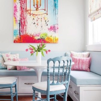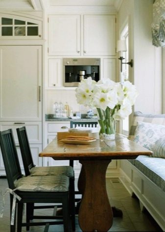 ينصح المصممون بشراء هيكل جلدي عملي للمطبخ. إنه رائع للديكورات الداخلية عالية التقنية والحديثة والبسيطة. الجلد الطبيعي سهل التنظيف والغسيل ، فهو لا يمتص الشحوم والغبار والأوساخ. إذا أرادت المضيفة إضافة المنسوجات في المطبخ ، فاحرص على الانتباه إلى النموذج مع تنجيد الجاكار أو القطيع أو الجبر. الأريكة على طراز بروفانس هي مزيج من المنسوجات أحادية اللون عالية الجودة أو التصاميم الزهرية والعناصر الخشبية.