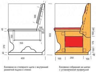 يتم توصيل الجوانب باستخدام قضبان أفقية ، ثم الهيكل الخلفي مصنوع من الخشب الرقائقي. في المرحلة النهائية ، من الضروري إرفاق المطاط الرغوي به. تتكون المقاعد من لوحين متوازيين و 4 ألواح متعامدة ، متصلة بمسامير خاصة ، ويتم تزيين الحزام بصفائح من الخشب الرقائقي. الشريط الطولي الموجود في الخلف متصل بمفصلات البيانو. يجب أن يتحرك غطاء المقعد للأمام بمقدار 30 مم ، مع تثبيت الزوايا المعدنية لمسند الظهر.