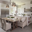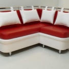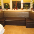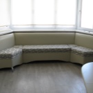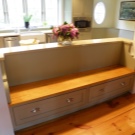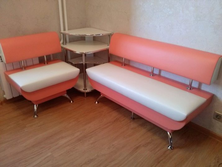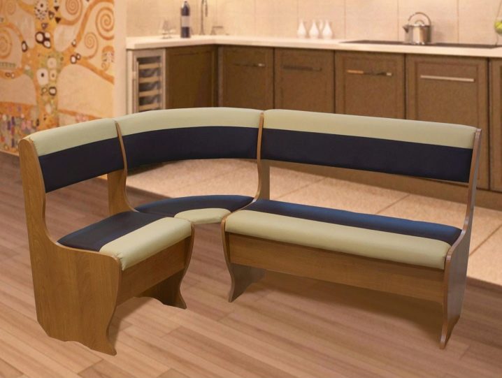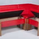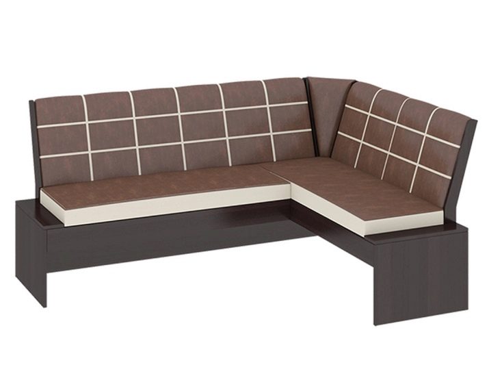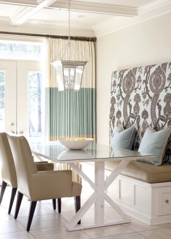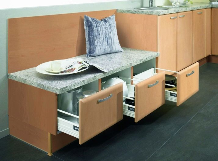 كلاسيكي حي من الأثاث المنجد الذي انتقل إلى المطبخ. العيب الرئيسي هو متطلبات المساحة الكبيرة – يجب أن يكون هناك مساحة كبيرة حتى لا تستقر مساند الذراعين على الطاولة ، ويفتح غطاء الدرج نفسه ، الذي يلعب دور المقعد ، بحرية دون لمس أي شيء.