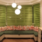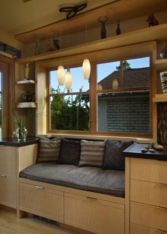 إذا كنت محظوظًا بما يكفي للحصول على مكانة خاصة في المطبخ ، بدءًا من حافة النافذة ، فإن أرائك النوافذ الكبيرة التي تشبه المضلع الموسع ستكون الديكور الداخلي المثالي. يمكن أن يكون خيارًا قابلًا للطي ، أو منطقة كلاسيكية تتسع من 4 إلى 5 أشخاص ، حسب عدد النوافذ.