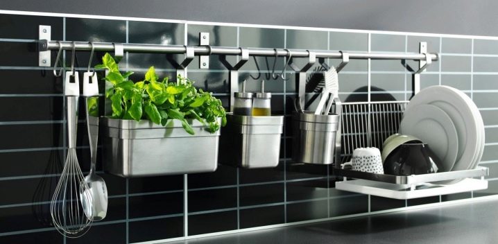 - سكة أفقية فوق سطح العمل. يمكن أن تستوعب العناصر الأكثر استخدامًا – المناشف ، وحاملات الأواني ، والمجارف ، والمغارف. من الملائم وضع جميع السكاكين على السكة المغناطيسية. يمكنك أيضًا تعليق أرفف شبكية للتوابل أو حامل منديل هناك..