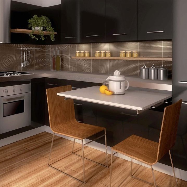 إذا كان لديك مطبخ صغير ، فمن المنطقي التفكير في خيارات متعددة قابلة للطي. على سبيل المثال ، طاولة رفع أو قابلة للسحب ، قابلة للسحب إلى خزانة أو طاولة كتب.