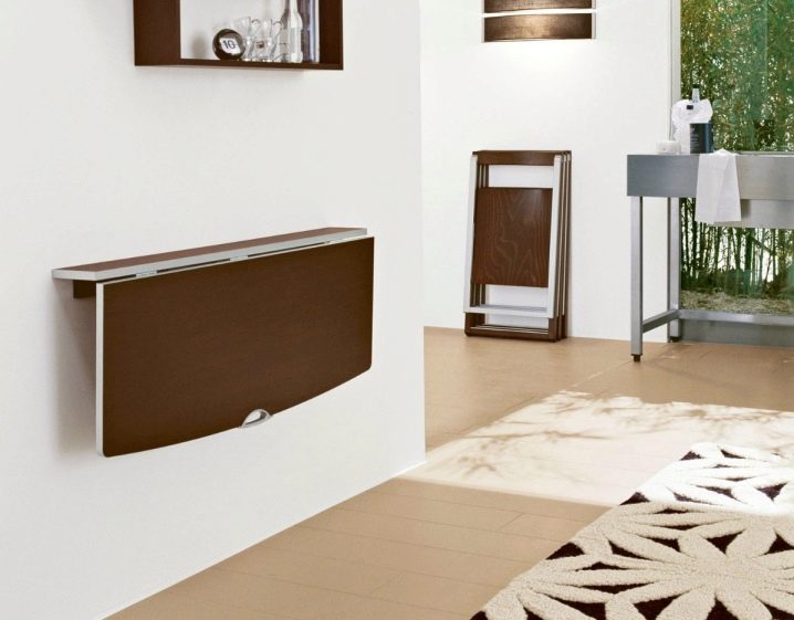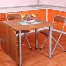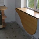 سطح طاولة قابلة للطي – يمكن أن يكون هناك العديد من الخيارات هنا ، بالإضافة إلى مبادئ التنفيذ. القاعدة متصلة بشكل صارم بالجدار وطاولة قابلة للطي مثبتة بها بالفعل ، مع أو بدون مقاعد قابلة للطي. عيب هذا النهج هو أنه سيتعين دائمًا طيها بعد الوجبة. إذا سمحت المساحة ، فيمكن الاحتفاظ بها مكشوفة أو جعلها محرجة بشكل عام مع وجود مساحة للأرجل ، ويمكن دفع الكراسي هناك عندما لا تكون هناك حاجة إليها.