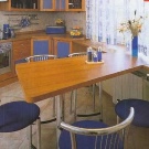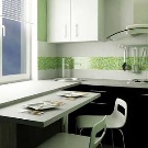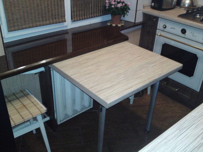 سطح طاولة قابل للطي – خيار آخر لا يخلو من عيوبه. يمكن دفعها إلى طاولة العمل وإخفائها تحت سطح العمل الرئيسي. الخيار غير مريح تمامًا ، حيث لا يوجد مكان لإزالة الكراسي ، وسطح قطعة العمل الرئيسية من الداخل ، كقاعدة عامة ، مزدحم بأدوات المطبخ والأواني.