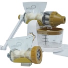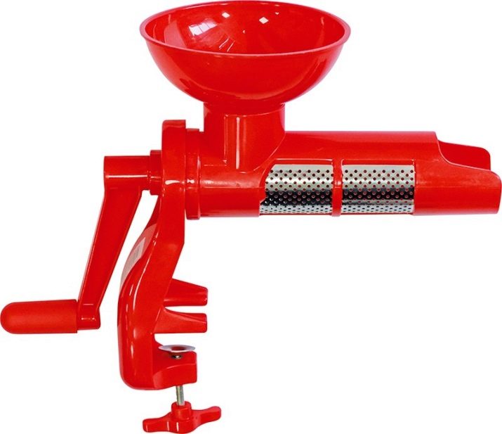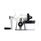 يسمى هذا النوع من الضغط بمساعد مضيفة عالمي. يشبه تصميمها جهاز فرم اللحم. هنا أيضًا ، يتم وضع الفاكهة في الرقبة ، ويتم تمريرها بمساعدة البريمة وتظهر في شكل هريس على الرف السلكي ، وهناك ، بمساعدة مكبس ، يتم الحصول على العصير من المهروس.