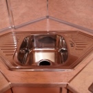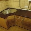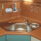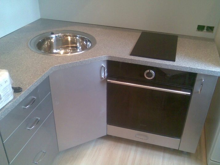 - حجر الرصيف الموجود في الزاوية عبارة عن قاعدة لرسو السفن ، وعادة ما يستخدم كحجر رصيف للحوض ، كما أنه متعدد الاستخدامات. أولاً ، فهو يجمع بين خزانة قاعدة ومغسلة. وثانيًا ، يسمح لك بإخفاء جميع الأنابيب بشكل جميل وتوفير مساحة من أعين المتطفلين. مثل هذا الحجر له واجهة واحدة وشكل مستطيل. يجب تثبيته في الزاوية ، وبالفعل عند الزوايا اليمنى ، يتم توصيل وحدات المطبخ المتبقية.