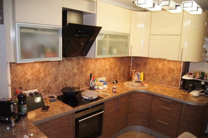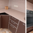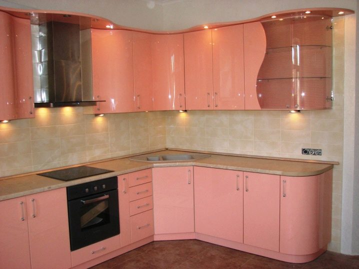 - على شكل حرف L. لها جبهتان ، تفتحان معًا ومنفصلة. في مثل هذه الخزانات ، لا يمكن بناء الحوض فحسب ، بل أيضًا جميع أنواع الآليات ، بالإضافة إلى الأرفف البسيطة.
