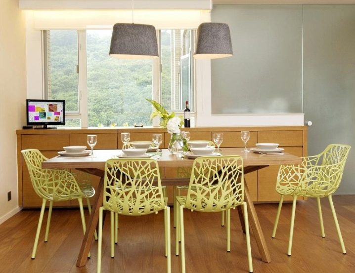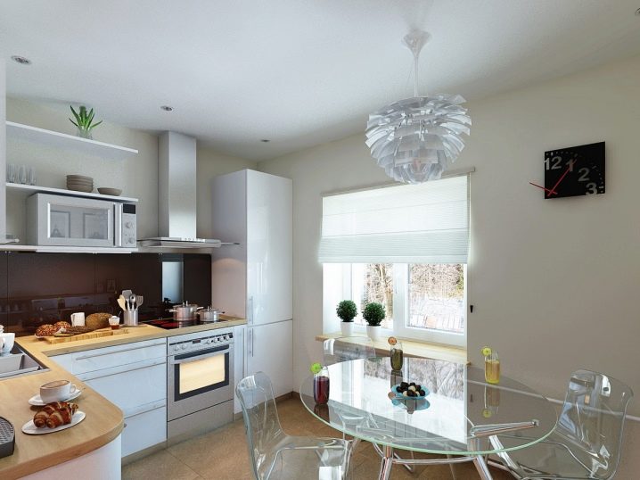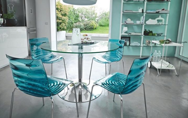 إذا كان المطبخ صغيرًا نوعًا ما ، فهناك حل في هذه الحالة أيضًا. أصبحت الكراسي الزجاجية أو البلاستيكية الشفافة عصرية الآن. سوف يتركون الضوء من خلال أنفسهم وبالتالي يعطون الانطباع بأنهم ليسوا موجودين على الإطلاق. سيعطي هذا مطبخك مساحة أكبر وإضاءة بصرية. على الرغم من أنها مضغوطة ، يبدو أن الكراسي ، بأي حال من الأحوال ، تفرض أراضيها الصغيرة. يمكن أن يعزى هذا الخيار إلى أسلوب بساطتها..