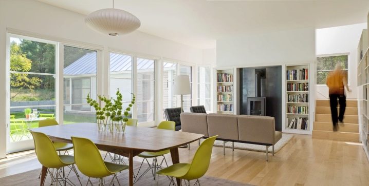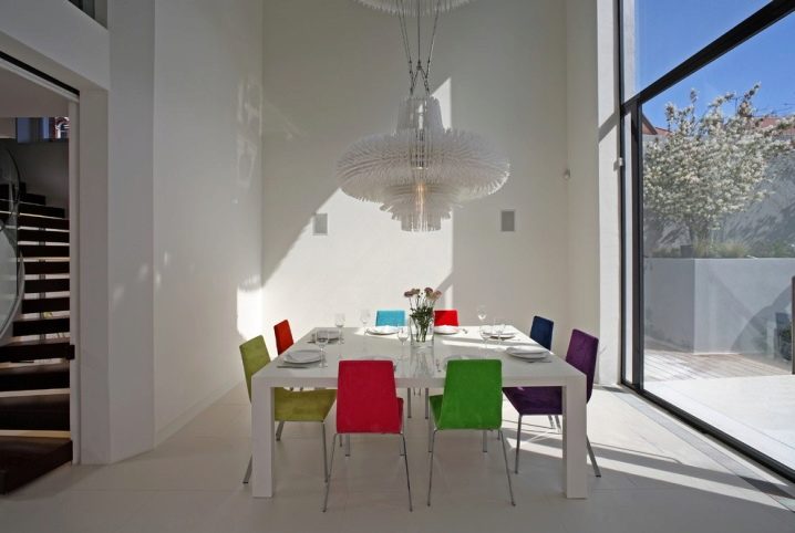 - أسلوب عالي التقنية – كراسي أصلية غير عادية إلى حد ما. قد لا يكون كل كرسي مثل الآخرين ، فهذه هي خصوصية الأسلوب. مادة التصنيع ليست من الخشب ، بل المعدن أو البلاستيك أو حتى الزجاج. لن يحبه الجميع ، ولكن بفضل تفرده ، فاز بقلوب الكثير من الناس.