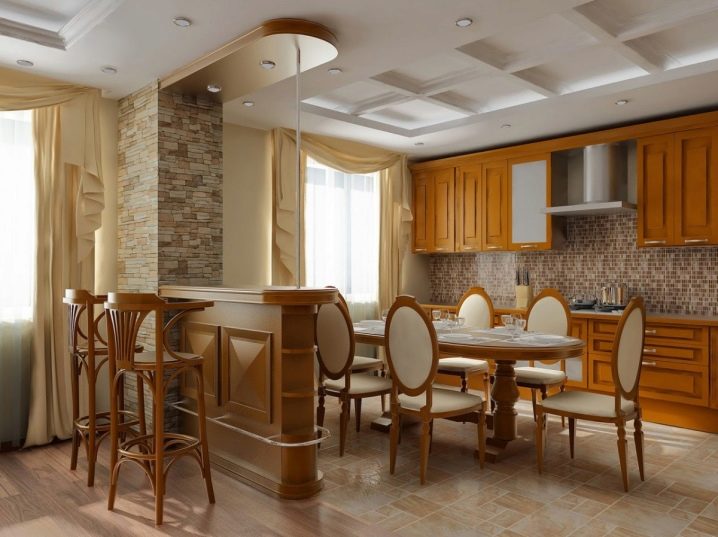 إذا كان مطبخك كبيرًا بدرجة كافية ، فيجب أن يقع الاختيار على كراسي بالحجم المناسب. يمكن أن تكون هذه كراسي عالية وكراسي بذراعين مع مساند للذراعين وكراسي وأرائك وما إلى ذلك. مع الحجم الصغير للمطبخ ، فإن البراز هو الأنسب لك ، على ساق واحدة ، قابل للطي ، إلخ..