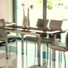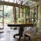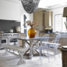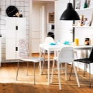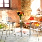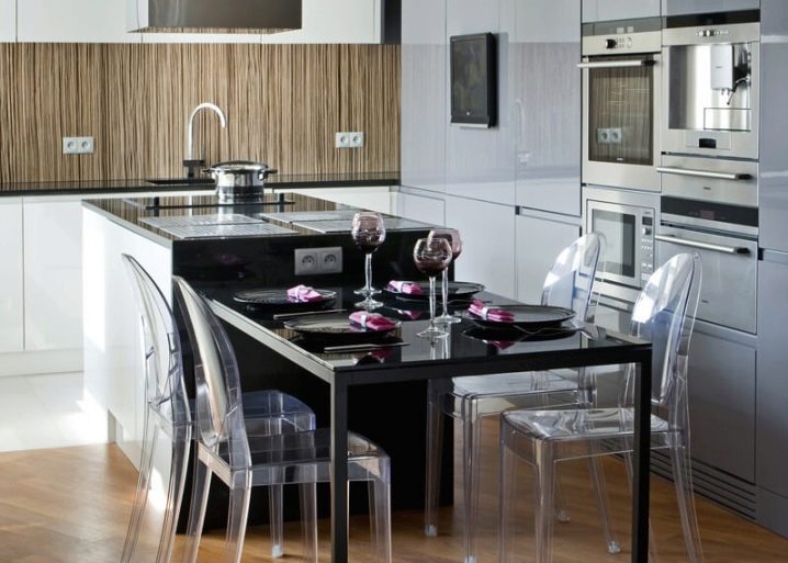 إذا كان المطبخ صغيرًا نوعًا ما ، فهناك حل في هذه الحالة أيضًا. أصبحت الكراسي الزجاجية أو البلاستيكية الشفافة عصرية الآن. سوف يتركون الضوء من خلال أنفسهم وبالتالي يعطون الانطباع بأنهم ليسوا موجودين على الإطلاق. سيعطي هذا مطبخك مساحة أكبر وإضاءة بصرية. على الرغم من أنها مضغوطة ، يبدو أن الكراسي ، بأي حال من الأحوال ، تفرض أراضيها الصغيرة. يمكن أن يعزى هذا الخيار إلى أسلوب بساطتها..