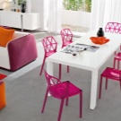 - أسلوب عالي التقنية – كراسي أصلية غير عادية إلى حد ما. قد لا يكون كل كرسي مثل الآخرين ، فهذه هي خصوصية الأسلوب. مادة التصنيع ليست من الخشب ، بل المعدن أو البلاستيك أو حتى الزجاج. لن يحبه الجميع ، ولكن بفضل تفرده ، فاز بقلوب الكثير من الناس.