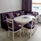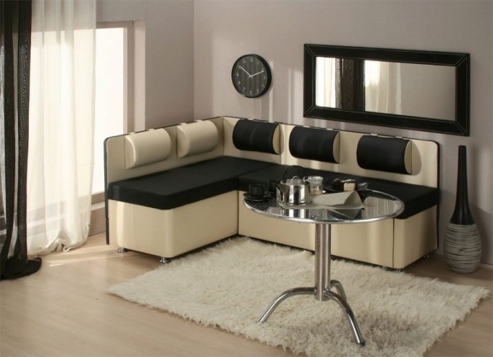يمكن أن يستوعب نموذج الركن على شكل حرف L أيضًا ما يصل إلى شخصين على جناحه. مثل هذا النموذج ، كقاعدة عامة ، يأتي بدون آلية قابلة للطي ، وبالتالي ، فهو جامد إلى حد ما. لن تجد هنا ملحقات باهظة الثمن ، ولكن يمكن تضمين صناديق لتخزين الطعام والأشياء وأدوات المطبخ.