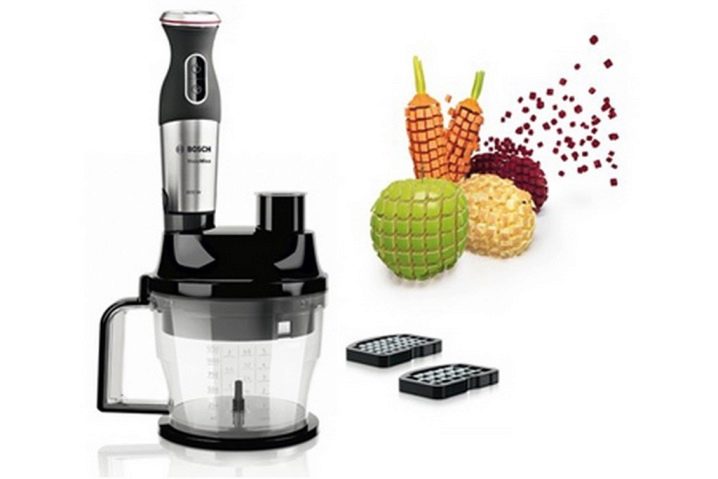 في الجزء العلوي من الموديلات المشهورة ، توجد أيضًا خلاطات مكعبة. لقد وجد وضع مثير للاهتمام تطبيقه في الجهاز بوش MSM 881X1. هناك 4 إدخالات لتقطيع العديد من المنتجات مرة واحدة ، بالإضافة إلى عنصر إضافي يساعد على تقطيع المكونات إلى مكعبات. وبالتالي ، ستكون قادرًا على إعداد أطباق رائعة ، ليس فقط لذيذة ، ولكن أيضًا جميلة من الناحية الجمالية..