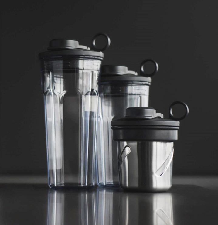 يحتوي الخلاط الثابت على وعاء رئيسي و 3 أكواب أنيقة بأغطية ، حيث يمكنك صب طعامك وأخذها معك. هذا النموذج محبوب من قبل الرياضيين ولاعبي كمال الأجسام لأنه مثالي للعصائر ، ومخفوق البروتين ، ويتعامل بسهولة مع الخضار والمكسرات..