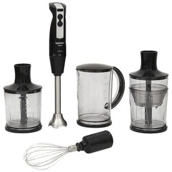 يتضمن الطقم قطاعة صغيرة بغطاء وكوب وملحقات للخلط ومضرب. الساق المعدنية تطيل عمر المنتج. تمنح الشركة المصنعة ضمانًا لمدة عامين عليها..