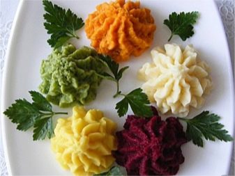 تبدو البطاطا الملونة مثيرة للاهتمام. لتحقيق ألوان مختلفة ، يضاف هريس الجزر أو البنجر أو البقدونس أو البروكلي أو اليقطين إلى الخليط النهائي. يتم سلق كل مكون من المكونات المشرقة مسبقًا وتحويلها إلى خليط متجانس ، لأن مدة تقطيع البطاطس والخضروات الأخرى يمكن أن تختلف.