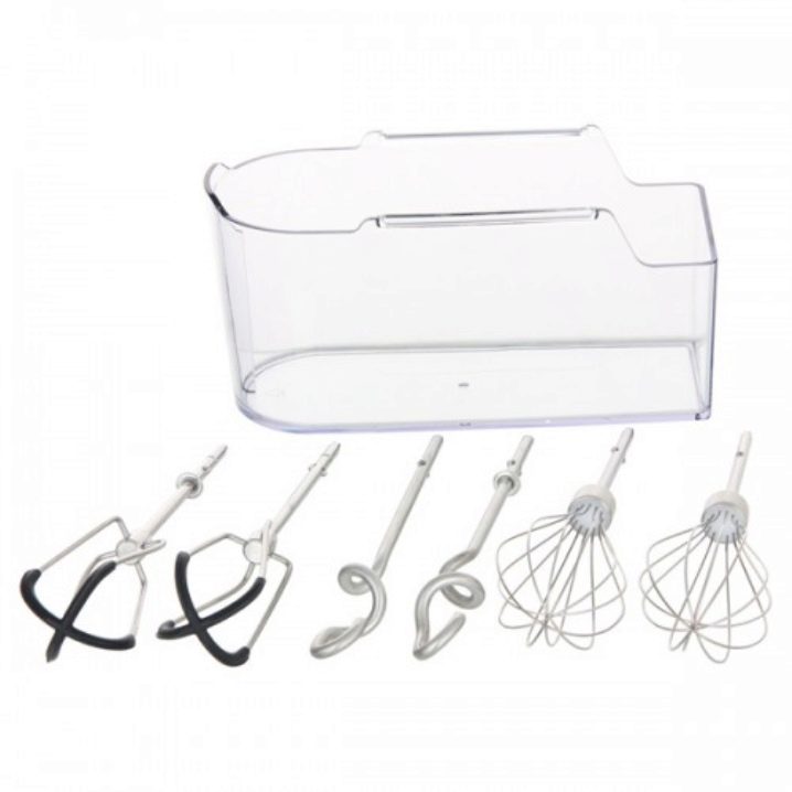 تشتمل المجموعة على ملحقات – كاشطات للعجين السائل ، وخفاقات للقشدة ، وعجان للعجين السميك. يتم تخزين كل هذا في حاوية بلاستيكية توضع عليها وحدة المحرك..
