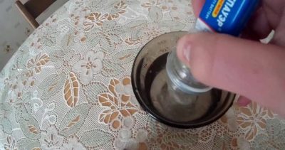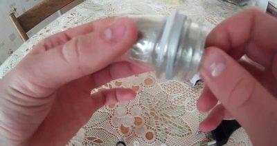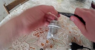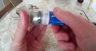 - بينما يجف الغراء ، ننتهي من قطعة العمل بالمحرك. نقلب الزجاج رأسًا على عقب حتى نتمكن من رؤية المحرك يدخل في الفتحة.