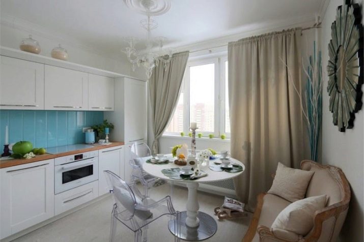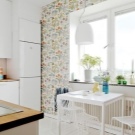 - إذا كانت منطقة تناول الطعام مصنوعة بالكامل باللون الأبيض أو بعض الألوان المماثلة ، فيمكنك إنشاء لهجات من خلال اللعب بالقوام, على النحو الوارد أعلاه ، أو مع الديكور والأنماط. سيكون الخيار المثير للاهتمام هو استخدام ورق الحائط الأبيض مع زخرفة مزخرفة معقدة ؛ يمكنك أيضًا التوصية بالستائر المعلقة ذات المظلة الفاخرة. يمكن أن يكون غطاء الأرضية هو الاختلاف التالي. في هذه الحالة ، سيكون من المثير للاهتمام بشكل خاص تجربة المربعات التي يتم تقديمها في أوسع نطاق. من بينها ، يمكنك العثور على أنماط معقدة يمكن أن تعطي ديناميكيات للمطبخ..