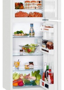 تحتوي الغرفة العلوية على رف واحد أو أكثر ، حسب الطراز ؛ الجزء السفلي ، بالإضافة إلى الرفوف ، مجهز بميزات إضافية. تحتوي جميع الموديلات على صناديق واسعة لتخزين الطعام ، وصواني الثلج ، والمراكم الباردة. ميزات إضافية: