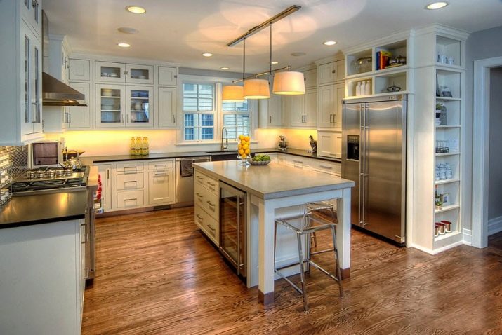 يمكن إضافة لمسة عصرية مثيرة للاهتمام إلى النمط التقليدي لمساحة المطبخ على شكل ثلاجة ذات لون معدني. سيساعد ذلك في إضافة القليل من النضارة إلى التصميم وجعله أقل صرامة..