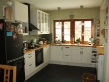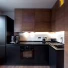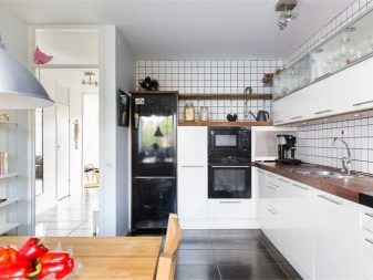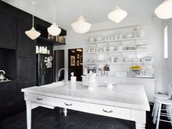 لا بأس إذا تم اختيار مقياس ضوئي لتصميم المطبخ – ستظهر وحدة سوداء عليه كلكنة مستقلة. يمكنك أيضًا شراء فرن ميكروويف أو ، على سبيل المثال ، جهاز تلفزيون كدعم له من نفس اللون. إذا لم يتم ذلك ، فقد يكون الرجل الوسيم الأسود الأنيق من بين كل بياض المطبخ في دور “البطة القبيحة”. يمكن أن يكون الاختيار الممتاز هو مزيج من وحدة سوداء مع سطح عمل من نفس اللون ، مع براز أو مع واجهة خزائن المطبخ. سيبدو المطبخ أيضًا أنيقًا للغاية ، حيث لا يقتصر الأمر على الثلاجة ذات الألوان الداكنة فحسب ، بل أيضًا على الأرضية. يمكن أن يكون طلاء بلون خالص أو ، على سبيل المثال ، نمط أبيض وأسود..