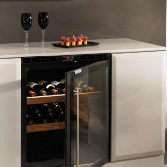 بالنسبة للمنزل حيث من المعتاد إقامة الحفلات أو حفلات الاستقبال بين الحين والآخر ، يمكن أن تكون الثلاجة على شكل خزانة نبيذ مصنوعة باللون الأسود عملية شراء ممتازة. وإذا كانت الوحدة الثابتة في نفس الوقت في نظام ألوان مشابه ، فسيكون هذا الثنائي قادرًا على تزيين مطبخك تمامًا..