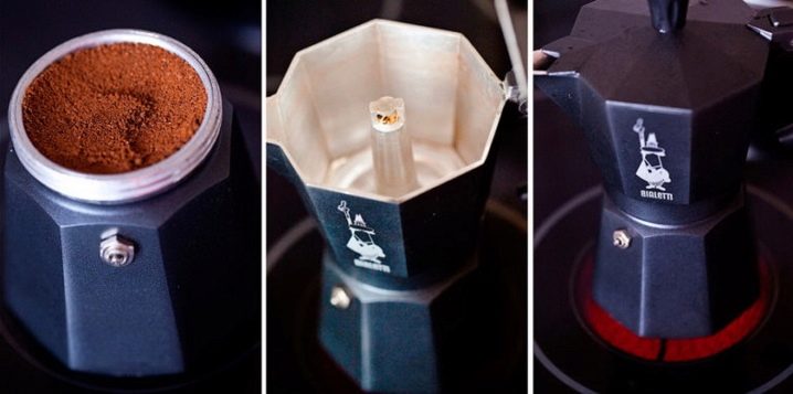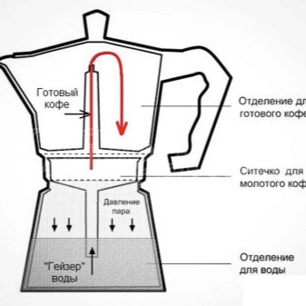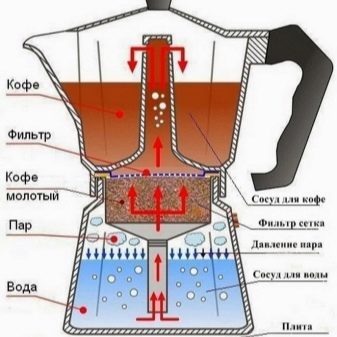 يتم سكب الكمية المطلوبة من الماء البارد في وعاء معدني (ليس أعلى من علامة الحد الأقصى). تُسكب حبوب البن المطحونة في الفلتر ، ويتم تركيب وعاء في الأعلى ، حيث يتم جمع المشروب القوي الجاهز. ثم يتم توصيل الجهاز بالتيار الكهربائي أو تثبيته على الموقد. عندما يسخن الماء ، يتحول إلى بخار ، مما يرفع بقية السائل إلى أعلى. يمر عبر فلتر بالقهوة ، حيث يتشبع بخصائص الطعم والرائحة. علاوة على ذلك ، تحت تأثير درجة الحرارة والضغط العالي ، يصل المشروب النهائي إلى القمة. تُسكب القهوة من النطاط العلوي في أكواب.