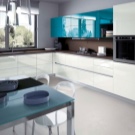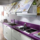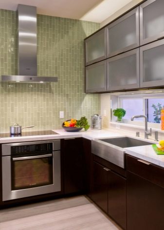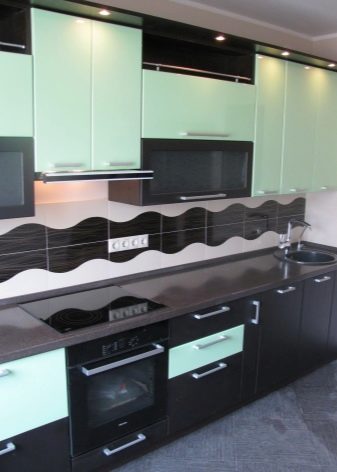 تحت سماعة رأس ملونة. في هذه الحالة ، يجب مراعاة لون وملمس جميع أسطح المطبخ ، بما في ذلك منطقة تناول الطعام. حتى المنسوجات متوسطة الحجم والتفاصيل الزخرفية تؤخذ في الاعتبار. الحل البسيط هو مئزر يتناسب مع لون أكبر الأسطح في المطبخ أو لون السماعة ولكن بألوان أفتح أو أغمق..