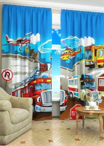 بمساعدة الستائر ، لا يمكن استكمالها فحسب ، بل أيضًا إنشاء موضوع للأطفال. على سبيل المثال ، لإنشاء سمة خاصة بالسيارات ، يمكنك ببساطة طلاء الجدران باللون الأزرق أو تطبيق خلفية زرقاء. يمكنك إنهاء تصميم هذه الغرفة بالستائر مع صور السيارات..