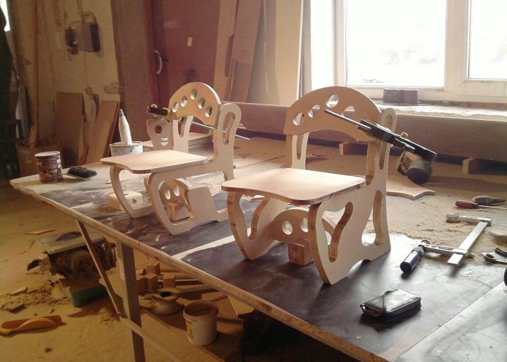 بناءً على أبعادنا ، نقوم بنقل رسم الكرسي إلى لوح من الخشب الرقائقي. باستخدام بانوراما ، يمكنك قطع شكل ثقب غير عادي ، مما يمنح الكرسي مظهرًا ممتعًا.