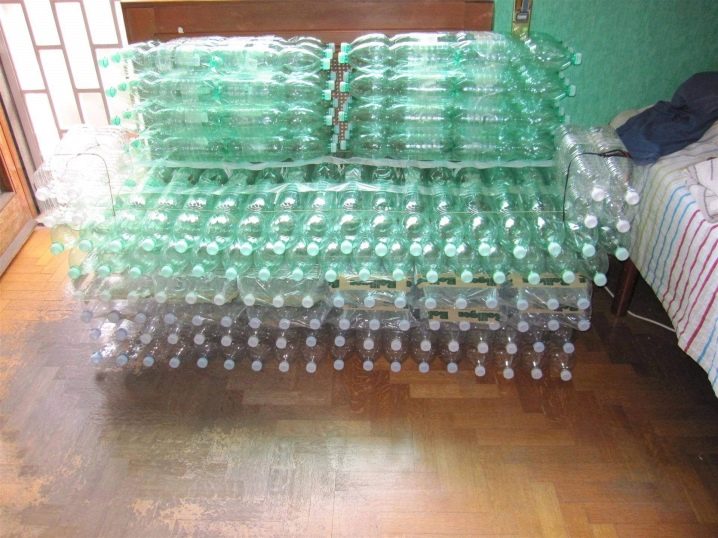 يمكنك أيضًا صنع أثاث للداشا من الزجاجات البلاستيكية. للقيام بذلك ، نختار زجاجات من نفس الحجم. يكفي الطفل بسعة 1 لتر. نلف بشريط لتشكيل مقعد. لجعل السطح مستويًا ، قم بتغطيته بصندوق خشبي. يبقى خياطة غطاء جلدي ، وبراز حديقة ممتاز جاهز.