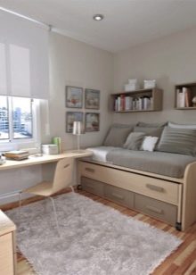 يجب أن تكون مساحة الغرفة متعددة الوظائف. يجب أن يكون هناك مكان للنوم ، ومنطقة للقراءة ، وخزانة ملابس ، ومنضدة للزينة ، ومعدات للتمارين الرياضية إذا رغبت في ذلك ، وما إلى ذلك. الشيء الرئيسي هو أن الفتاة تحب قضاء الوقت في غرفتها.