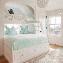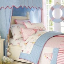 يمكنك إنشاء غرفة نوم جذابة لفتاة و أسلوب بحري. النغمات الزرقاء والزرقاء لها تأثير مفيد ومهدئ على النفس. بالإضافة إلى ذلك ، ستسمح لك الرسومات الجميلة للجزر والقوارب وما إلى ذلك بتزيين غرفة ترفيه الأطفال بنجاح..