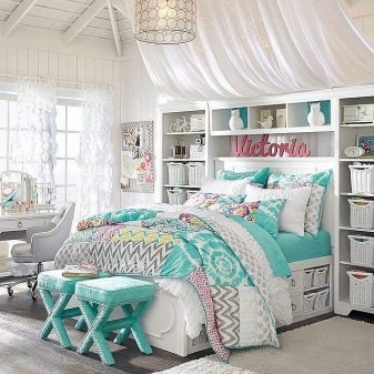 بالنسبة للون ، لا يزال من المستحسن استخدام نغمات لطيفة. ومع ذلك ، في هذا العصر ، يمكن أيضًا صنع اللهجات. يمكن أن تكون المنسوجات والوسائد والستائر وغيرها من العناصر الداخلية التي ستساعد كل فتاة على الكشف عن شخصيتها..