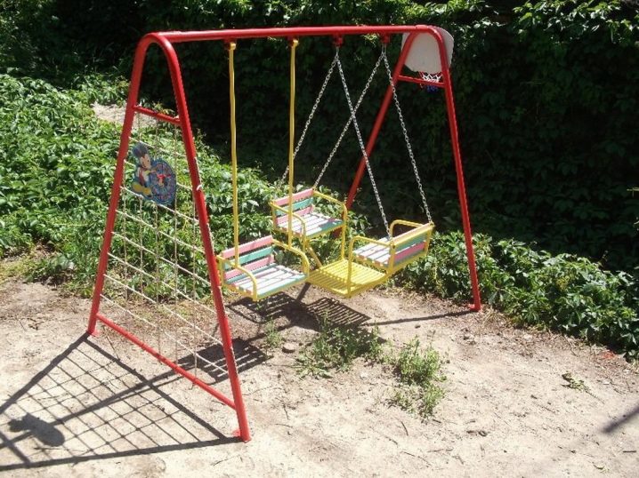 إذا اشتريت أرجوحة ، فمن الأفضل أن تختار بنية معدنية صلبة.. في هذه الحالة ، يتكون الإطار من أنابيب فولاذية. إنها جيدة لأنها تتحمل الأحمال الثقيلة ، لذلك إذا تأرجح عليها العديد من الأطفال في وقت واحد ، فلن تنكسر الأعمدة على أي حال.