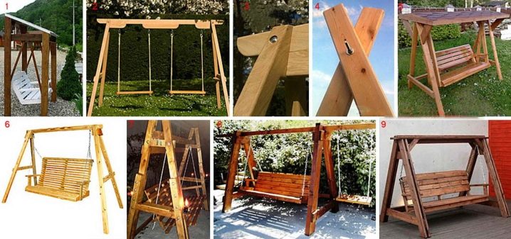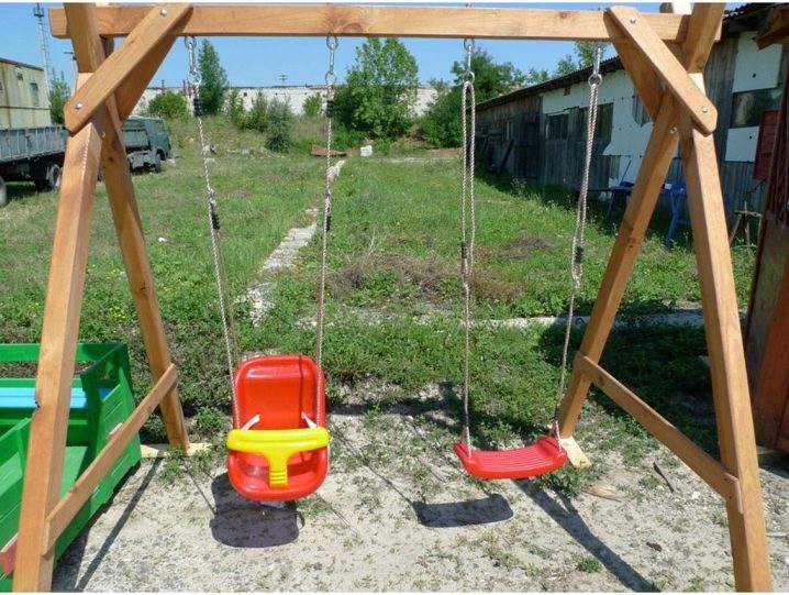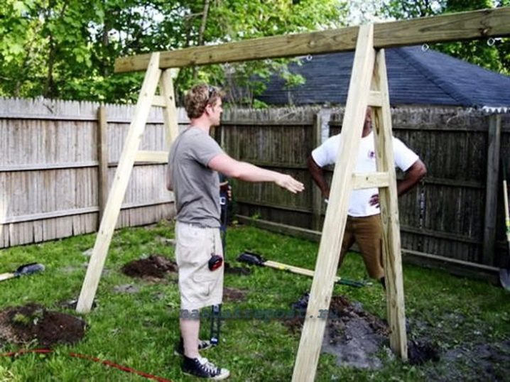 - يمكنك أيضًا عمل تصميم أكثر تعقيدًا.. لإنشائه ، سيكون عليك عمل إطار خشبي. لإنشائه ، اربط دعامة واحدة من القضبان على شكل الحرف A. يتم توصيل دعامتين من هذا القبيل بواسطة عارضة. المقعد متصل به بالحبال..