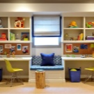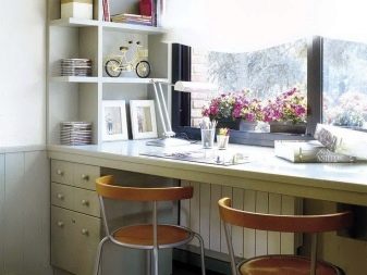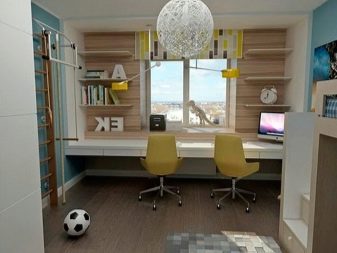 سطح طاولة صلب بطول النافذة. مع هذا الترتيب ، سيجلس الأطفال في مكتب المدرسة. يجدر الاهتمام بفصل المساحة الشخصية لكل طفل ، خاصة إذا كان سيتم استخدام هذا الأثاث لصبي وفتاة في نفس الوقت. غالبًا في مثل هذه الحالات ، يستخدمون خزانة بين محطات العمل أو رفًا على الطاولة للكتب أو قسمًا شفافًا..