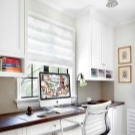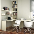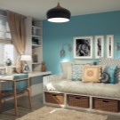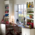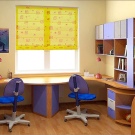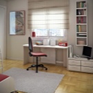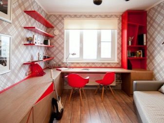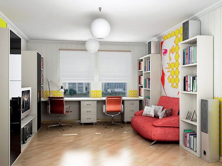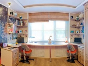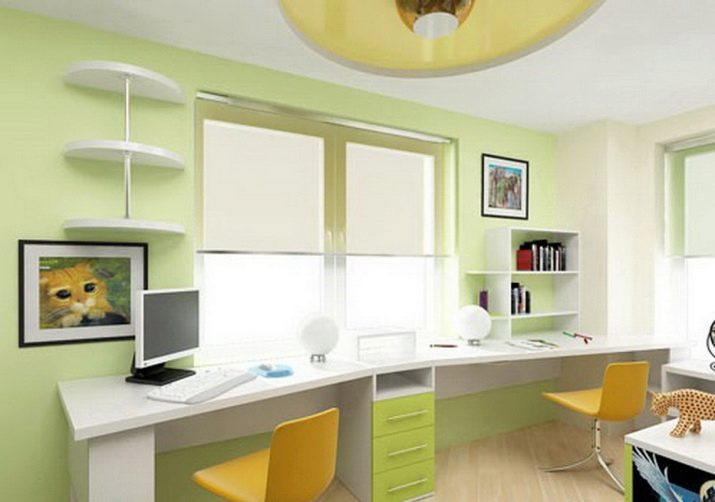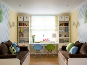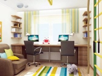 جدولين متطابقين. هذا التعديل جيد لأنه يوجد ممر بين المكاتب ، والذي يقسم المساحة بشكل طبيعي. أيضًا ، يفتح الوصول المجاني إلى النافذة دون الحاجة إلى الوقوف على الأثاث. النقطة المهمة للغاية هي أن الطاولات متشابهة ولكل طفل نفس عدد الأدراج والأرفف لممتلكاته الشخصية. يجب إيلاء اهتمام خاص للإضاءة ، حيث يسقط الضوء من جوانب مختلفة.