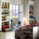 يعد اختيار مكان للمكتب أحد النقاط المهمة في تصميم غرفة الأطفال.. يفضل بعض الآباء وضع هذا الأثاث بمحاذاة الحائط. هذا الخيار مناسب لأنه يمكن وضع عدد كبير من الأرفف المفصلية للكتب واللوازم المكتبية فوق سطح العمل. سيوفر مثل هذا الحل تفريغ الجدول نفسه ، ولكن مع هذا الترتيب ، تقل المساحة الخالية للغرفة بشكل كبير..