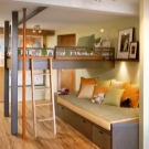 - إذا كانت غرفة النوم صغيرة جدًا ، فيمكنك اختيار نماذج مدمجة. ستكون بعض العناصر قابلة للطي. إذا لزم الأمر ، سيتم إخفاء الجدول ، وسيتم دمج الخطوات مع أدراج للأغراض الشخصية. هذه الأسرة العلوية مناسبة للشقق ذات الأسقف المنخفضة..