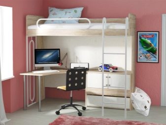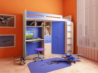 يعد خيار السرير مع منطقة العمل أكثر ملاءمة للأولاد والمراهقين في سن المدرسة. غرفة النوم مفصولة عن منطقة العمل بواسطة أقسام. غالبًا ما تكون هذه الأقسام بمثابة أرفف كتب وأدراج للأغراض الشخصية. سيحب كل صبي أن يكون السرير في الطابق العلوي ، لأنه لا داعي لترتيب السرير كل يوم.