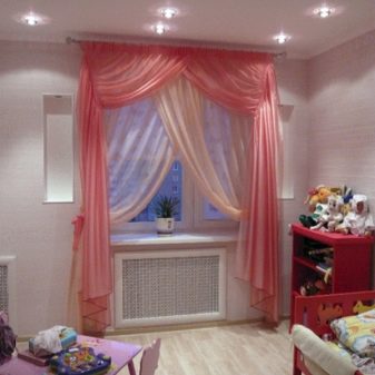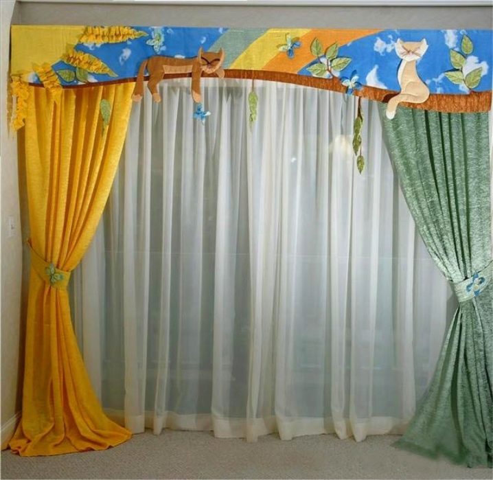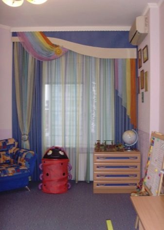 النسخة الكلاسيكية من الستائر لغرفة الأطفال عبارة عن تول لنشر الضوء وستارة من القماش السميك لإغلاق النافذة ليلاً. يمكن استكمال الستائر بلامبريكين – هذا هو الجزء العلوي من الستارة ، وعادة ما يكون مصنوعًا من قماش سميك. يستخدم Lambrequin بشكل أكبر كعنصر زخرفي ، مما يمنح النافذة تعبيرًا إضافيًا ، ولا يمكن أن يكون عمليًا.