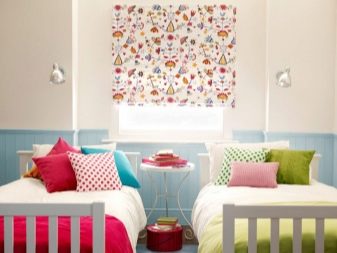 ستائر رومانية للحضانة – خيار تصميم نافذة حديث. إنها تمثل لوحات قماشية كثيفة ترتفع ، إذا تم سحبها بواسطة الدانتيل ، في شكل تجمعات من الجانبين. هذه الستائر مصنوعة من الكتان والقطن والمواد الطبيعية الأخرى. يمكن أن تكون الستائر الرومانية إما على شكل أقمشة أحادية اللون أو ملونة أو منقوشة. نسخة مثيرة للاهتمام من هيكل الرفع تجعل عملية فتح النافذة ممتعة للغاية بالنسبة للطفل.