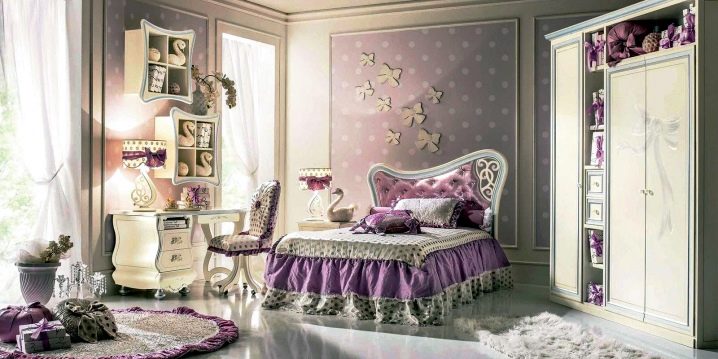 لأميرة حقيقية ، غرفة الأطفال تشمل ملاحظات الإمبراطورية. في هذه الحالة ، يتم اختيار ستائر غرفة الفتيات المراهقات بنسيج لامع وأنماط كبيرة و lurex. سيكون من المناسب استخدام الطيات المورقة والستائر وكذلك المسكات العريضة..