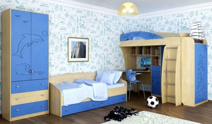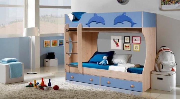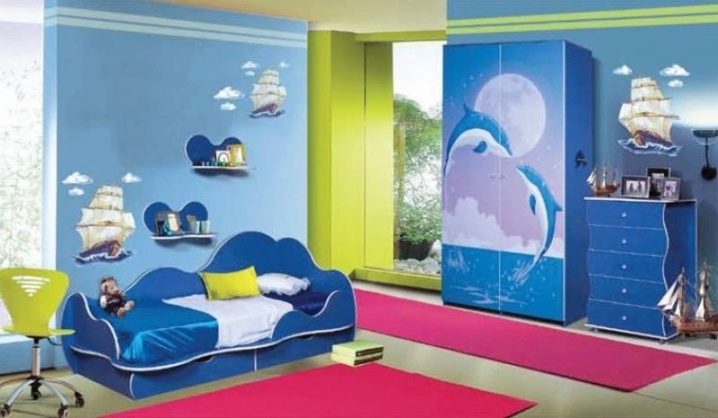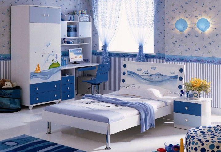 يساهم الدلفين في إنشاء موضوع بحري. يمكنك التقاط الكراسي العثمانية التي ستكون متناغمة مع لون السرير. يجب أن يعتمد على ظلال زرقاء وبيضاء وزرقاء..