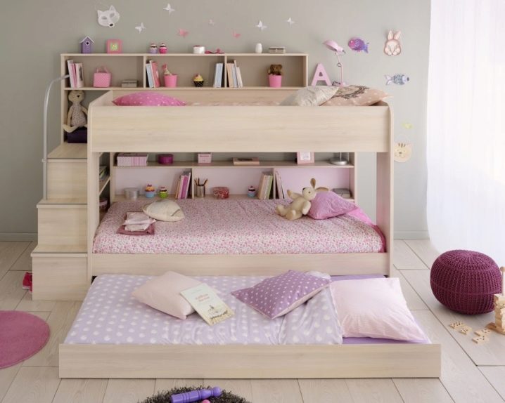 - سرير من ثلاث طبقات. هذا سرير بطابقين مع قسم إضافي يسحب للخارج. خيار رائع لثلاثة توائم أو فقط لعائلة كبيرة. على مثل هذا السرير ، يمكنك وضع ثلاثة أطفال في وقت واحد ، في الحالة المجمعة لن يستغرق أكثر من سرير بطابقين عادي.